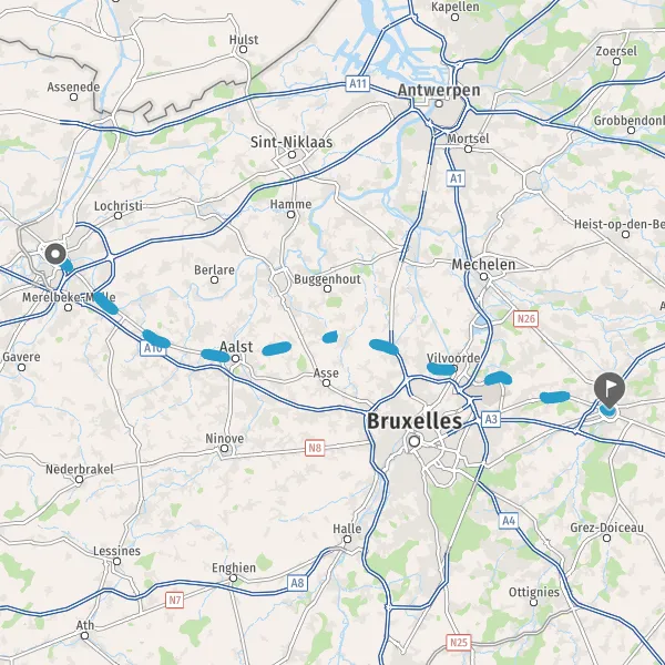 Hou links aan op N9 (Brusselsesteenweg) en volg gedurende 22 kilometer