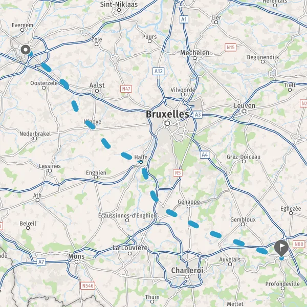 Aan het rondpunt neem de 3rd afslag N93 (Chaussée de Nivelles) en volg gedurende 8,2 kilometer