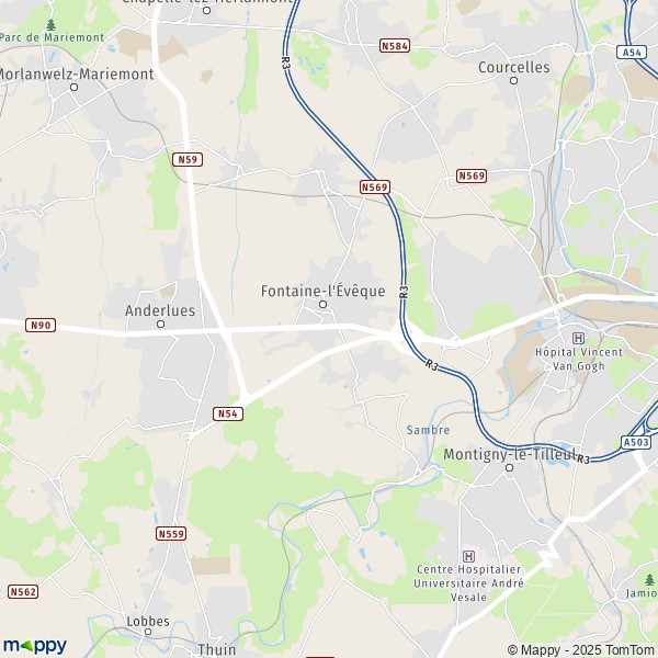Plattegrond Fontaine-l'Évêque : kaart van Fontaine-l'Évêque (6140) en praktische info